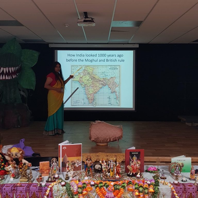 During this, they identify words in the Sanskrit lexicon that have transcended cultures and are utilized in contemporary English, such as 'karma' and 'yoga.' Additionally, students in Years 3 to 6 may engage in a foundational discussion addressing philosophical concepts presented in the text, including atman, reincarnation, moksha, and karma, facilitating an interactive question-and-answer session. We also introduce primary pupils to the Panchatantra, a collection of fables featuring animal characters that are believed to have inspired the Greek Aesop’s Fables, serving a similar educational purpose by conveying moral lessons associated with each narrative.